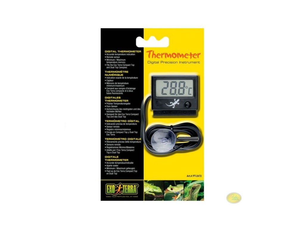 - Černý, digitální teploměr Exo Terra s přesností teploty na desetiny.