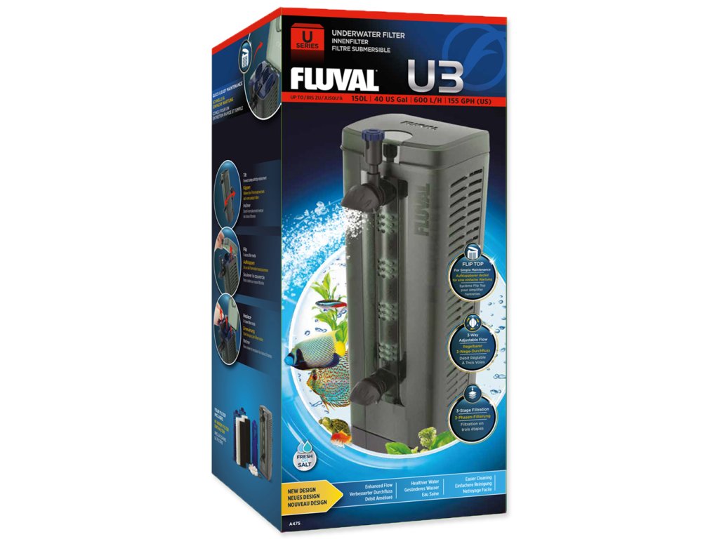 - Podvodní filtry řady Fluval U poskytují úplnou a účinnou třístupňovou filtraci, včetně biologického filtrování BIOMAX (modely U2, U3 a U4), čímž se dosahuje vynikající kvality akvarijní vody.