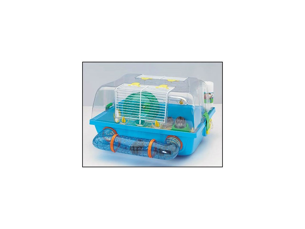 Klec pro malá zvířata a hlodavce vybavená překážkami i tunelem. Velikost: 42,5 x 38 x 24 cm, objem 0,029 ccm. Rozteč mezi dráty: 0,7 cm.