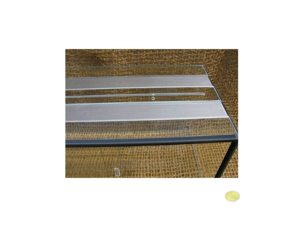 - Otevírání terária je řešeno pomocí dvou proti sobě posuvných skleněných dvířek - tzv. "šoupaček", které jsou vyjímatelné. Skleněná podélná výztuha, která je nalepená uvnitř terária na stropě, zaručuje pevnost i předního dílu stropu, takže je možné na terárium i něco položit. A zároveň 2 otvory o průměru 10 mm ve výztuze mohou posloužit jako úchyt pro tepelný zdroj.